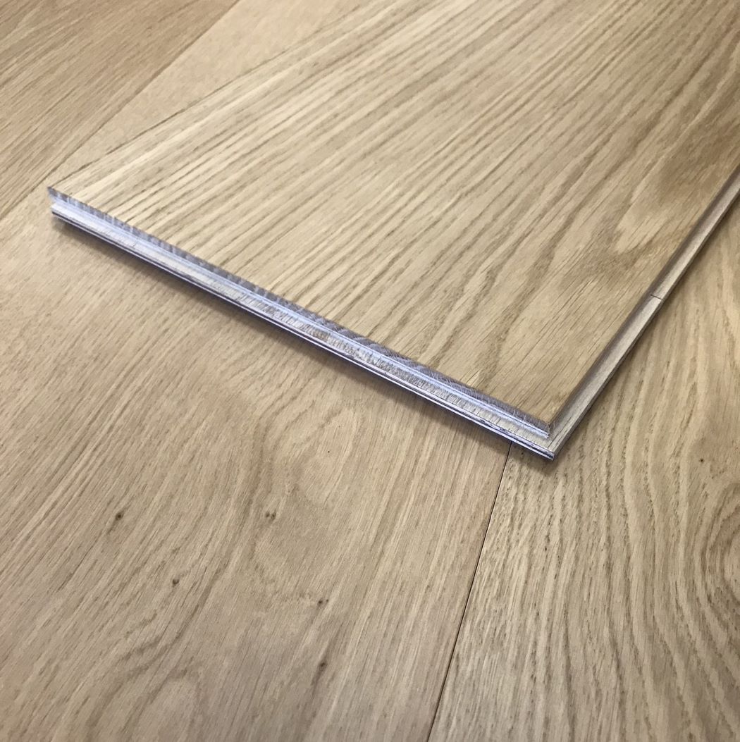 | Materialidad Composición | Base multilaminada + superficie de madera noble laqueada de fábrica. Rigidez comparable a tablas de madera maciza, de mayor estabilidad dimensional |
